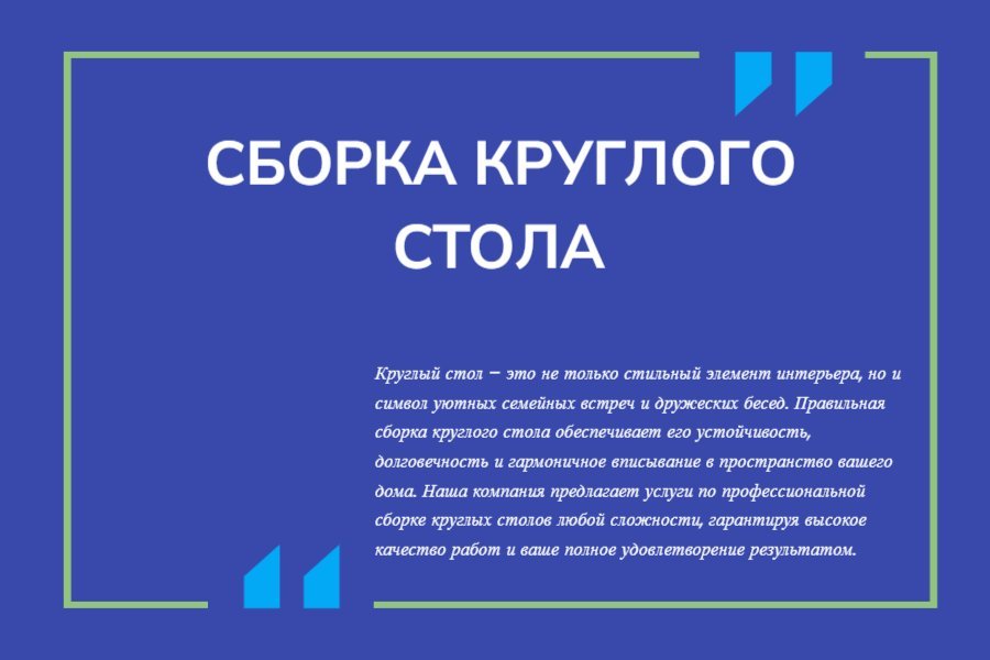 Круглый стол – это не только стильный элемент интерьера, но и символ уютных семейных встреч и дружеских бесед. Правильная сборка круглого стола обеспечивает его устойчивость, долговечность и гармоничное вписывание в пространство вашего дома. Наша компания предлагает услуги по профессиональной сборке круглых столов любой сложности, гарантируя высокое качество работ и ваше полное удовлетворение результатом.
